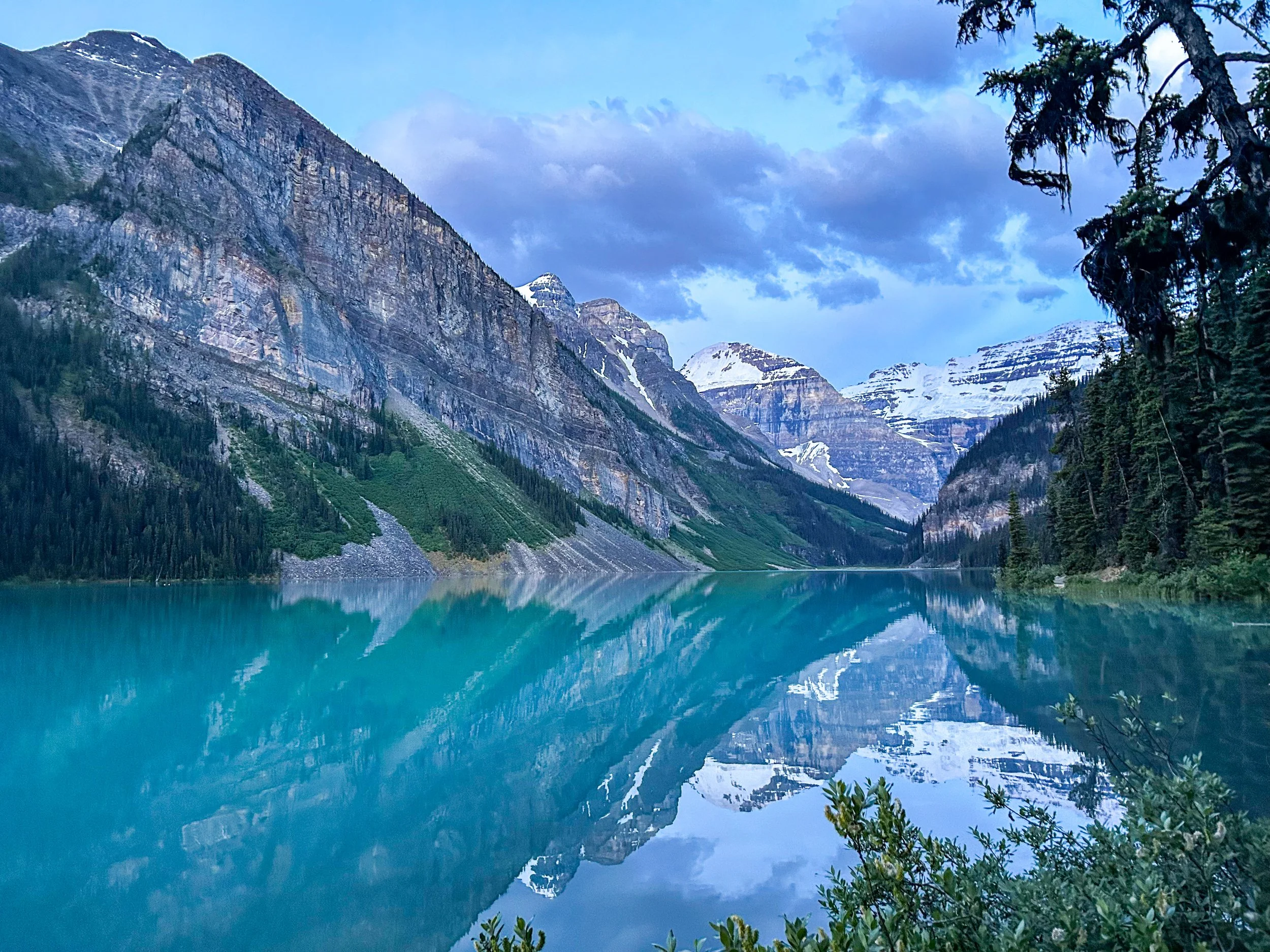 We camped at a simple lot 20 minutes from Lake Louise, which turned out to be perfect. We only really had one morning, so we had to make the most of it. We woke at 4am and got going to Lake Louise. Initially it seemed like it was already going to be packed, but then we realized the crowds were just getting on a shuttle to go to Lake Moraine. We were actually the only ones on the trail, starting right at 5am. Most people hang out at the far end of the lake by the hotel, and wait for a sunrise photo.